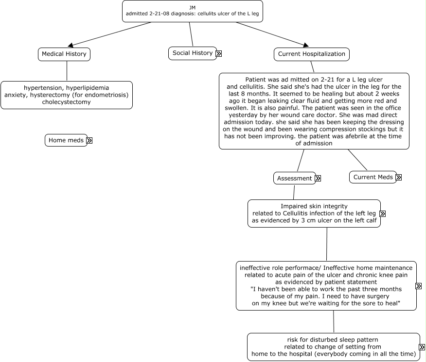 This Concept Map, created with IHMC CmapTools, has information related to: 2-25-08, JM admitted 2-21-08 diagnosis: cellulits ulcer of the L leg ???? Medical History, Patient was ad mitted on 2-21 for a L leg ulcer and cellulitis. She said she's had the ulcer in the leg for the last 8 months. It seemed to be healing but about 2 weeks ago it began leaking clear fluid and getting more red and swollen. It is also painful. The patient was seen in the office yesterday by her wound care doctor. She was mad direct admission today. she said she has been keeping the dressing on the wound and been wearing compression stockings but it has not been improving. the patient was afebrile at the time of admission ???? Current Meds, ineffective role performace/ Ineffective home maintenance related to acute pain of the ulcer and chronic knee pain as evidenced by patient statement "I haven't been able to work the past three months because of my pain. I need to have surgery on my knee but we're waiting for the sore to heal" ???? risk for disturbed sleep pattern related to change of setting from home to the hospital (everybody coming in all the time), JM admitted 2-21-08 diagnosis: cellulits ulcer of the L leg ???? Social History, Medical History ???? hypertension, hyperlipidemia anxiety, hysterectomy (for endometriosis) cholecystectomy, Patient was ad mitted on 2-21 for a L leg ulcer and cellulitis. She said she's had the ulcer in the leg for the last 8 months. It seemed to be healing but about 2 weeks ago it began leaking clear fluid and getting more red and swollen. It is also painful. The patient was seen in the office yesterday by her wound care doctor. She was mad direct admission today. she said she has been keeping the dressing on the wound and been wearing compression stockings but it has not been improving. the patient was afebrile at the time of admission ???? Assessment, JM admitted 2-21-08 diagnosis: cellulits ulcer of the L leg ???? Current Hospitalization, Impaired skin integrity related to Cellulitis infection of the left leg as evidenced by 3 cm ulcer on the left calf ???? ineffective role performace/ Ineffective home maintenance related to acute pain of the ulcer and chronic knee pain as evidenced by patient statement "I haven't been able to work the past three months because of my pain. I need to have surgery on my knee but we're waiting for the sore to heal", Current Hospitalization ???? Patient was ad mitted on 2-21 for a L leg ulcer and cellulitis. She said she's had the ulcer in the leg for the last 8 months. It seemed to be healing but about 2 weeks ago it began leaking clear fluid and getting more red and swollen. It is also painful. The patient was seen in the office yesterday by her wound care doctor. She was mad direct admission today. she said she has been keeping the dressing on the wound and been wearing compression stockings but it has not been improving. the patient was afebrile at the time of admission, Assessment ???? Impaired skin integrity related to Cellulitis infection of the left leg as evidenced by 3 cm ulcer on the left calf