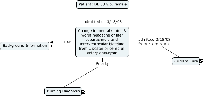 This Concept Map, created with IHMC CmapTools, has information related to: Patient 3.19, Change in mental status & "worst headache of life"; subarachnoid and interventricular bleeding from L posterior cerebral artery aneurysm Her Background Information, Patient: DL 53 y.o. female admitted on 3/18/08 Change in mental status & "worst headache of life"; subarachnoid and interventricular bleeding from L posterior cerebral artery aneurysm, Change in mental status & "worst headache of life"; subarachnoid and interventricular bleeding from L posterior cerebral artery aneurysm admitted 3/18/08 from ED to N-ICU Current Care, Change in mental status & "worst headache of life"; subarachnoid and interventricular bleeding from L posterior cerebral artery aneurysm Priority Nursing Diagnosis