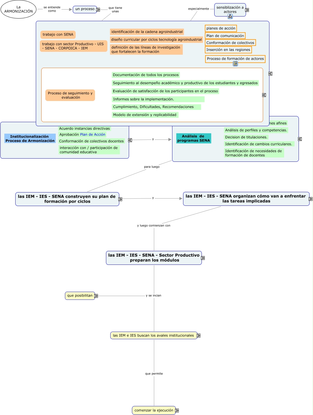 Este Cmap, tiene información relacionada con: modelo de armonización, las IEM - IES - SENA organizan cómo van a enfrentar las tareas implicadas y luego comienzan con las IEM - IES - SENA - Sector Productivo preparan los módulos, formación contínua de actores proceso posibilitar interacción entre actores, enlazar eslabones de las cadenas educativa y productiva proceso posibilitar interacción entre actores, organizar niveles educativos proceso posibilitar interacción entre actores, las IEM - IES - SENA - Sector Productivo preparan los módulos y se incian que posibilitan, los aliados se apropian de la lógica de la armonización y analizar las propuestas SENA, las IEM - IES - SENA construyen su plan de formación por ciclos y las IEM - IES - SENA organizan cómo van a enfrentar las tareas implicadas, las IEM e IES buscan los avales institucionales que permite comenzar la ejecución, analizar las propuestas SENA para luego las IEM - IES - SENA construyen su plan de formación por ciclos, acciones base contínuas que dan las condiciones para los aliados se apropian de la lógica de la armonización, las IEM - IES - SENA - Sector Productivo preparan los módulos y se incian las IEM e IES buscan los avales institucionales, La ARMONIZACIÓN se entiende como un proceso, un proceso que tiene unas acciones base contínuas, acciones base contínuas especialmente sensiblización a actores