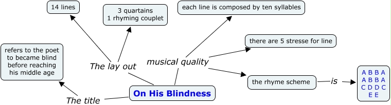 Questa Mappa Concettuale ha informazioni correlate a: giusti irene On his blindness L, On His Blindness musical quality there are 5 stresse for line, On His Blindness The title refers to the poet to became blind before reaching his middle age, On His Blindness The lay out 14 lines, the rhyme scheme is A B B A A B B A C D D C E E, On His Blindness musical quality the rhyme scheme, On His Blindness The lay out 3 quartains 1 rhyming couplet, On His Blindness musical quality each line is composed by ten syllables