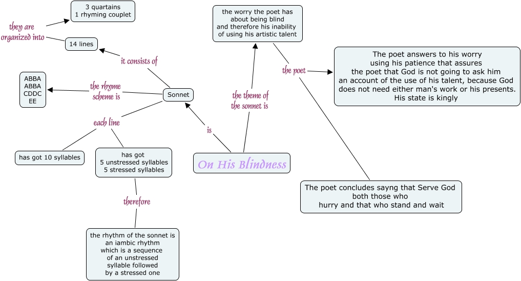 Questa Mappa Concettuale ha informazioni correlate a: Analisi sonetto elena masotti 3 L, Sonnet it consists of 14 lines, 14 lines they are organized into 3 quartains 1 rhyming couplet, On His Blindness is Sonnet, the worry the poet has about being blind and therefore his inability of using his artistic talent the poet The poet answers to his worry using his patience that assures the poet that God is not going to ask him an account of the use of his talent, because God does not need either man's work or his presents. His state is kingly, Sonnet the rhyme scheme is ABBA ABBA CDDC EE, the worry the poet has about being blind and therefore his inability of using his artistic talent the poet The poet concludes sayng that Serve God both those who hurry and that who stand and wait, On His Blindness the theme of the sonnet is the worry the poet has about being blind and therefore his inability of using his artistic talent, has got 5 unstressed syllables 5 stressed syllables therefore the rhythm of the sonnet is an iambic rhythm which is a sequence of an unstressed syllable followed by a stressed one, Sonnet each line has got 5 unstressed syllables 5 stressed syllables, Sonnet each line has got 10 syllables