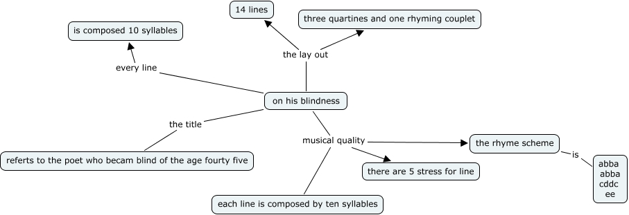Questa Mappa Concettuale ha informazioni correlate a: sonetto on his blindness elena dell'amico3L, on his blindness the lay out 14 lines, on his blindness musical quality each line is composed by ten syllables, on his blindness the lay out three quartines and one rhyming couplet, on his blindness musical quality there are 5 stress for line, on his blindness the title referts to the poet who becam blind of the age fourty five, on his blindness every line is composed 10 syllables, on his blindness musical quality the rhyme scheme, the rhyme scheme is abba abba cddc ee