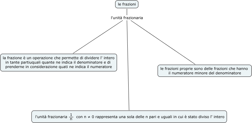 Questa Cmap, creata con IHMC CmapTools, contiene informazioni relative a: le frazioni, le frazioni l'unità frazionaria <math xmlns="http://www.w3.org/1998/Math/MathML"> <mrow> <mtext> l'unità frazionaria </mtext> <mfrac> <mtext> 1 </mtext> <mtext> n </mtext> </mfrac> <mtext> con n ≠ 0 rappresenta una sola delle n pari e uguali in cui è stato diviso l' intero </mtext> </mrow> </math>, le frazioni l'unità frazionaria le frazioni proprie sono delle frazioni che hanno il numeratore minore del denominatore, le frazioni l'unità frazionaria la frazione è un operazione che permette di dividere l' intero in tante partiuquali quante ne indica il denominatore e di prenderne in considerazione quati ne indica il numeratore