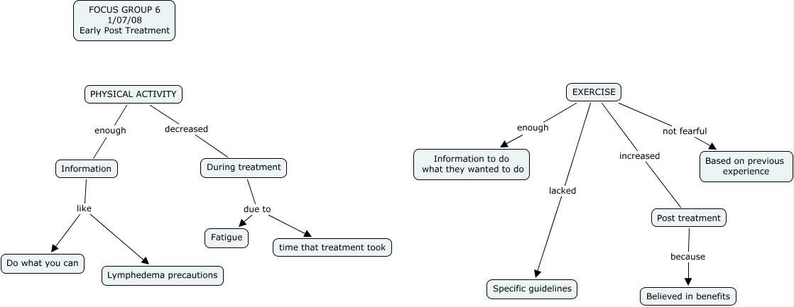 This Concept Map, created with IHMC CmapTools, has information related to: Focus Group 6.ts, EXERCISE increased Post treatment, Information like Do what you can, EXERCISE not fearful Based on previous experience, PHYSICAL ACTIVITY enough Information, PHYSICAL ACTIVITY decreased During treatment, Information like Lymphedema precautions, Post treatment because Believed in benefits, During treatment due to Fatigue, During treatment due to time that treatment took, EXERCISE enough Information to do what they wanted to do, EXERCISE lacked Specific guidelines