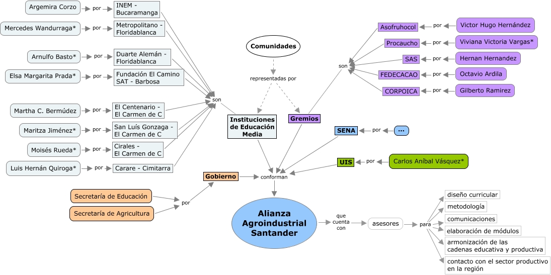 Este mapa conceptual tiene información relacionada a: ActoresAlianza, Maritza Jiménez* por San Luís Gonzaga - El Carmen de C, Secretaría de Agricultura por Gobierno, Elsa Margarita Prada* por Fundación El Camino SAT - Barbosa, Victor Hugo Hernández por Asofruhocol, Comunidades representadas por Gremios, Gremios conforman Alianza Agroindustrial Santander, asesores para elaboración de módulos, Moisés Rueda* por Cirales - El Carmen de C, UIS conforman Alianza Agroindustrial Santander, Viviana Victoria Vargas* por Procaucho