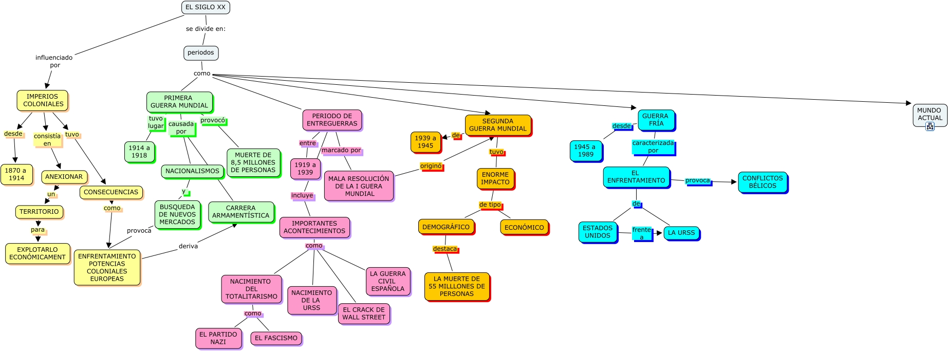 Este Cmap, tiene información relacionada con: EL SIGLO XX, EL SIGLO XX influenciado por IMPERIOS COLONIALES, NACIMIENTO DEL TOTALITARISMO como EL PARTIDO NAZI, DEMOGRÁFICO destaca LA MUERTE DE 55 MILLLONES DE PERSONAS, NACIONALISMOS y BUSQUEDA DE NUEVOS MERCADOS, IMPORTANTES ACONTECIMIENTOS como LA GUERRA CIVIL ESPAÑOLA, PERIODO DE ENTREGUERRAS incluye IMPORTANTES ACONTECIMIENTOS, ENORME IMPACTO de tipo DEMOGRÁFICO, ENORME IMPACTO de tipo ECONÓMICO, periodos como PRIMERA GUERRA MUNDIAL, PRIMERA GUERRA MUNDIAL provocó MUERTE DE 8,5 MILLONES DE PERSONAS, periodos como SEGUNDA GUERRA MUNDIAL, GUERRA FRÍA desde 1945 a 1989, IMPERIOS COLONIALES tuvo CONSECUENCIAS, ENFRENTAMIENTO POTENCIAS COLONIALES EUROPEAS deriva CARRERA ARMAMENTÍSTICA, NACIMIENTO DEL TOTALITARISMO como EL FASCISMO, periodos como PERIODO DE ENTREGUERRAS, EL ENFRENTAMIENTO de ESTADOS UNIDOS, SEGUNDA GUERRA MUNDIAL de 1939 a 1945, CONSECUENCIAS como ENFRENTAMIENTO POTENCIAS COLONIALES EUROPEAS, SEGUNDA GUERRA MUNDIAL tuvo ENORME IMPACTO