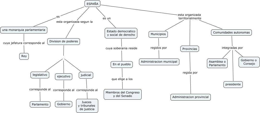 Este mapa conceptual tiene información relacionada a: Maria Bejarano Periñan nº4 3ºB U.11, En el pueblo que elige a los Miembros del Congreso y del Senado, Provincias regida por Administracion provincial, ESPAÑA esta organizada territorialmente Municipios, ejecutivo corresponde al Gobierno, Comunidades autonomas integradas por Asamblea o Parlamento, ESPAÑA esta organizada territorialmente Provincias, ESPAÑA es una monarquia parlamentaria, una monarquia parlamentaria cuya jefatura corresponde al Rey, legislativo corresponde al Parlamento, Municipios regidos por Administracion municipal