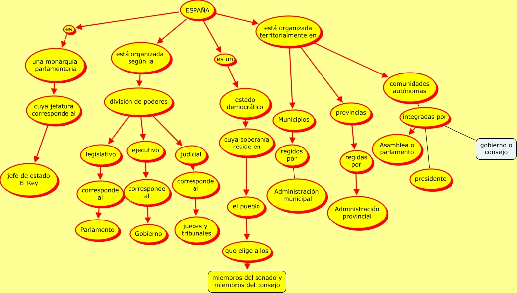 Este mapa conceptual tiene información relacionada a: julia millán gómez n21 3ºB ESPAÑA, ESPAÑA está organizada según la división de poderes, ESPAÑA es una monarquía parlamentaria, estado democrático cuya soberanía reside en el pueblo, comunidades autónomas integradas por Asamblea o parlamento, provincias regidas por Administración provincial, comunidades autónomas integradas por gobierno o consejo, ESPAÑA está organizada territorialmente en provincias, legislativo corresponde al Parlamento, ejecutivo corresponde al Gobierno, judicial corresponde al jueces y tribunales