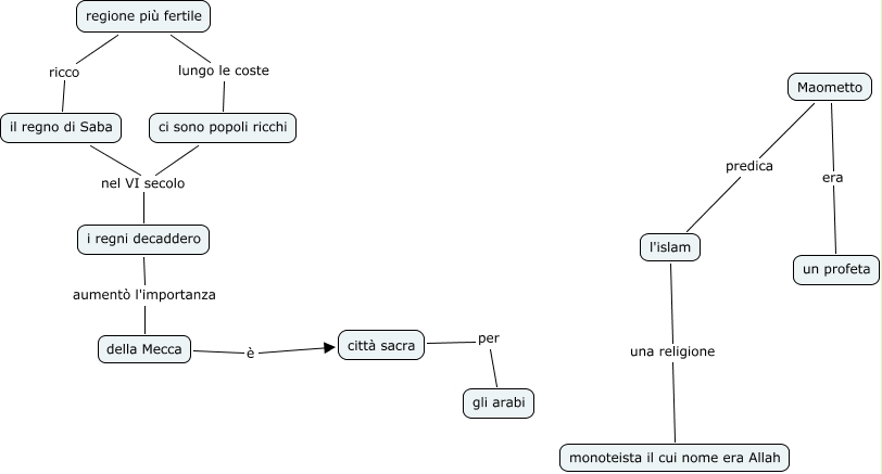 Questa Cmap, creata con IHMC CmapTools, contiene informazioni relative a: gli arabi 2, città sacra per gli arabi, regione più fertile lungo le coste ci sono popoli ricchi, l'islam una religione monoteista il cui nome era Allah, Maometto predica l'islam, ci sono popoli ricchi nel VI secolo i regni decaddero, i regni decaddero aumentò l'importanza della Mecca, Maometto era un profeta, regione più fertile ricco il regno di Saba, il regno di Saba nel VI secolo i regni decaddero, della Mecca è città sacra