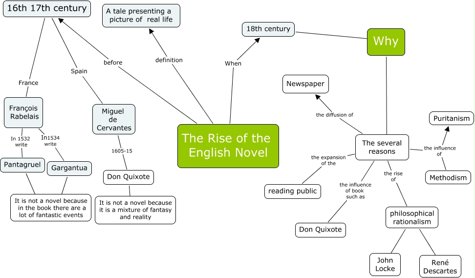 Questa Mappa Concettuale ha informazioni correlate a: The rise of the English novel by Bonanni 4D, The several reasons the influence of Methodism, 16th 17th century France François Rabelais, 18th century ???? Why, The several reasons the influence of Puritanism, The Rise of the English Novel definition A tale presenting a picture of real life, philosophical rationalism ???? John Locke, The several reasons the diffusion of Newspaper, The several reasons the influence of book such as Don Quixote, philosophical rationalism ???? René Descartes, Why ???? The several reasons, 16th 17th century Spain Miguel de Cervantes, François Rabelais In 1532 write Pantagruel, Miguel de Cervantes 1605-15 Don Quixote, The Rise of the English Novel before 16th 17th century, François Rabelais In1534 write Gargantua, Don Quixote ???? It is not a novel because it is a mixture of fantasy and reality, Pantagruel ???? It is not a novel because in the book there are a lot of fantastic events, The several reasons the expansion of the reading public, The Rise of the English Novel When 18th century, The several reasons the rise of philosophical rationalism