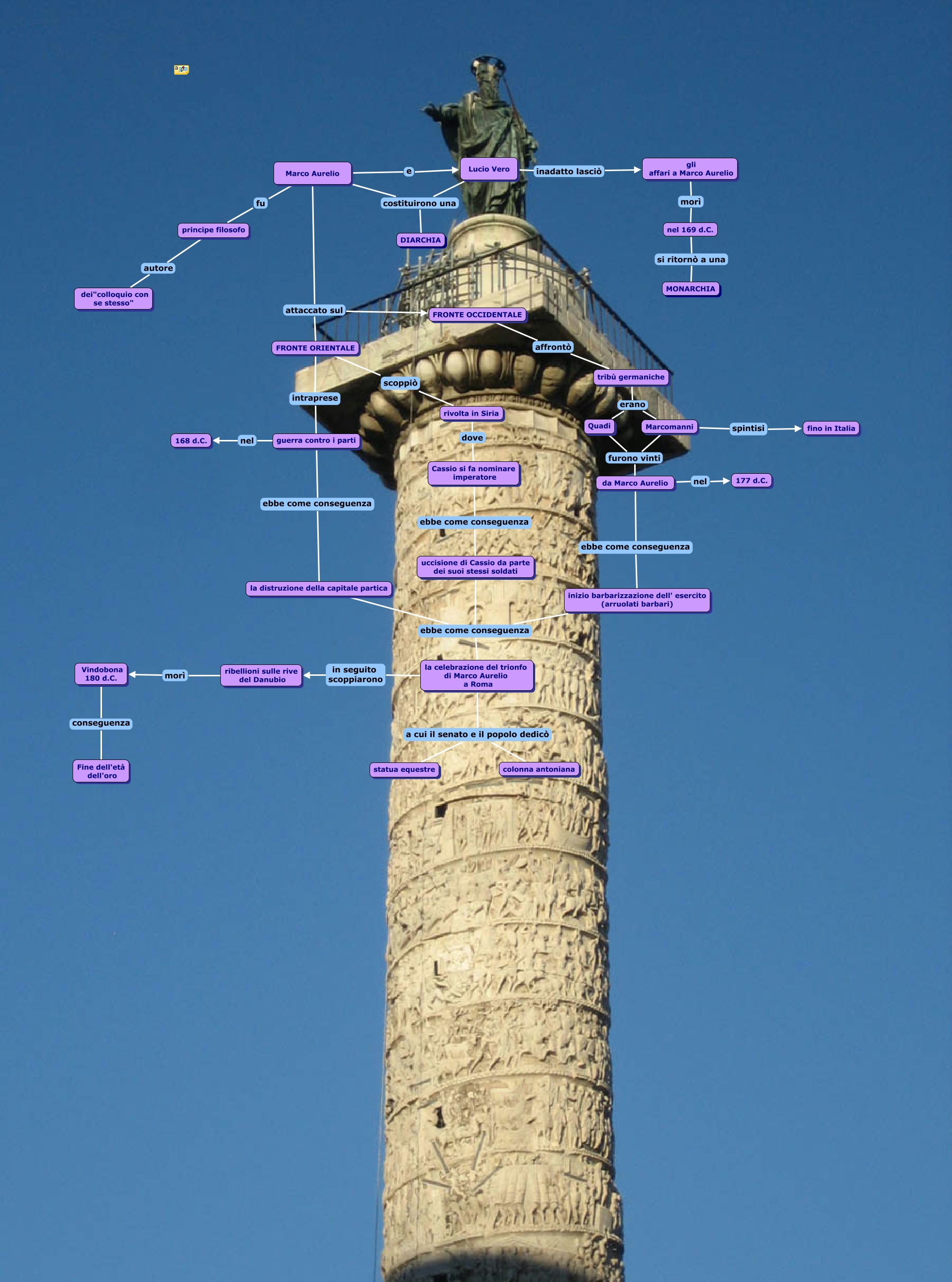 Questa Mappa Concettuale ha informazioni correlate a: Marco Aurelio e Lucio Vero, Marco Aurelio attaccato sul FRONTE OCCIDENTALE, la celebrazione del trionfo di Marco Aurelio a Roma a cui il senato e il popolo dedicò colonna antoniana, Marco Aurelio attaccato sul FRONTE ORIENTALE, Marco Aurelio fu principe filosofo, Cassio si fa nominare imperatore ebbe come conseguenza uccisione di Cassio da parte dei suoi stessi soldati, Lucio Vero costituirono una DIARCHIA, da Marco Aurelio ebbe come conseguenza inizio barbarizzazione dell' esercito (arruolati barbari), rivolta in Siria dove Cassio si fa nominare imperatore, la distruzione della capitale partica ebbe come conseguenza la celebrazione del trionfo di Marco Aurelio a Roma, tribù germaniche erano Marcomanni, da Marco Aurelio nel 177 d.C., Marco Aurelio e Lucio Vero, Marco Aurelio costituirono una DIARCHIA, la celebrazione del trionfo di Marco Aurelio a Roma a cui il senato e il popolo dedicò statua equestre, ribellioni sulle rive del Danubio morì Vindobona 180 d.C., FRONTE OCCIDENTALE affrontò tribù germaniche, Vindobona 180 d.C. conseguenza Fine dell'età dell'oro, nel 169 d.C. si ritornò a una MONARCHIA, Quadi furono vinti da Marco Aurelio, guerra contro i parti nel 168 d.C.