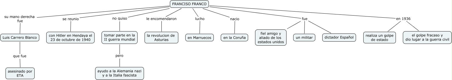 Este mapa conceptual tiene información relacionada a: 20.Pepe Romero Morales. Francisco Franco, FRANCISO FRANCO en 1936 realiza un golpe de estado, FRANCISO FRANCO le encomendaron la revolucion de Asturias, Luis Carrero Blanco que fue asesinado por ETA, FRANCISO FRANCO no quiso tomar parte en la II guerra mundial, FRANCISO FRANCO nacio en la Coruña, tomar parte en la II guerra mundial pero ayudo a la Alemania nazi y a la Italia fascista, FRANCISO FRANCO fue dictador Español, FRANCISO FRANCO fue fiel amigo y aliado de los estados unidos, FRANCISO FRANCO fue un militar, FRANCISO FRANCO en 1936 el golpe fracaso y dio lugar a la guerra civil