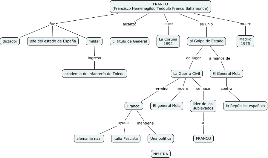 Este Cmap, tiene información relacionada con: 10.Ángela Gil Román, La Guerra Civil se hace lider de los sublevados, militar ingreso academia de infantería de Toledo, FRANCO (Francisco Hemenegildo Teódulo Franco Bahamonde) muere Madrid 1975, FRANCO (Francisco Hemenegildo Teódulo Franco Bahamonde) fue dictador, El General Mola contra la República española, lider de los sublevados a FRANCO, Una política NEUTRA, al Golpe de Estado a manos de El General Mola, al Golpe de Estado da lugar La Guerra Civil, FRANCO (Francisco Hemenegildo Teódulo Franco Bahamonde) alcanzó El titulo de General, FRANCO (Francisco Hemenegildo Teódulo Franco Bahamonde) nace La Coruña 1892, FRANCO (Francisco Hemenegildo Teódulo Franco Bahamonde) fue militar, Franco ayuda italia Fascista, Franco ayuda alemania nazi, FRANCO (Francisco Hemenegildo Teódulo Franco Bahamonde) se unió al Golpe de Estado, Franco mantiene Una política, FRANCO (Francisco Hemenegildo Teódulo Franco Bahamonde) fue jefe del estado de España, La Guerra Civil muere El general Mola, La Guerra Civil termina Franco