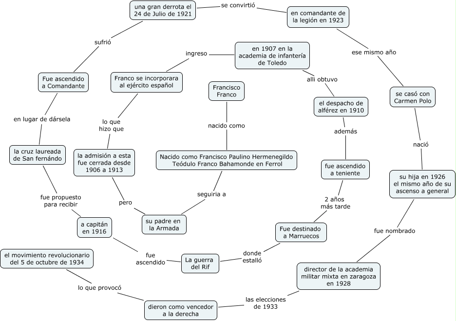 Este mapa conceptual tiene información relacionada a: 09.Alberto Fernández Foncilla.Franco, Francisco Franco nacido como Nacido como Francisco Paulino Hermenegildo Teódulo Franco Bahamonde en Ferrol, el despacho de alférez en 1910 además fue ascendido a teniente, su hija en 1926 el mismo año de su ascenso a general fue nombrado director de la academia militar mixta en zaragoza en 1928, Nacido como Francisco Paulino Hermenegildo Teódulo Franco Bahamonde en Ferrol seguiria a su padre en la Armada, en 1907 en la academia de infantería de Toledo alli obtuvo el despacho de alférez en 1910, se casó con Carmen Polo nació su hija en 1926 el mismo año de su ascenso a general, en comandante de la legión en 1923 ese mismo año se casó con Carmen Polo, fue ascendido a teniente 2 años más tarde Fue destinado a Marruecos