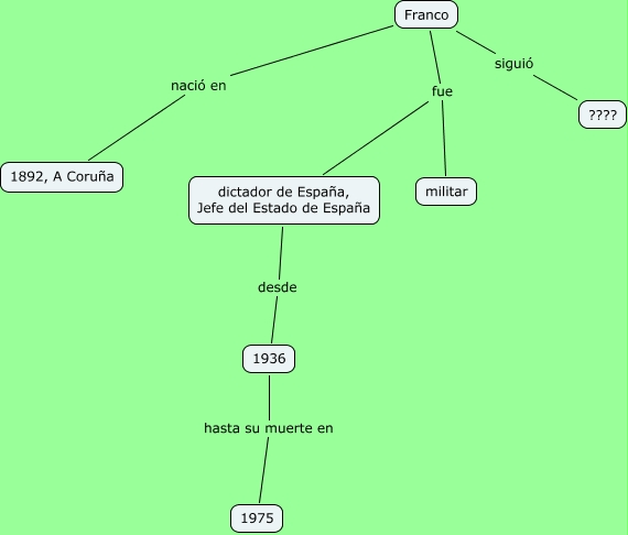 Este mapa conceptual tiene información relacionada a: 12.Laura Montero Acosta, Franco nació en 1892, A Coruña, Franco fue dictador de España, Jefe del Estado de España, 1936 hasta su muerte en 1975, Franco fue militar, Franco siguió ????, dictador de España, Jefe del Estado de España desde 1936