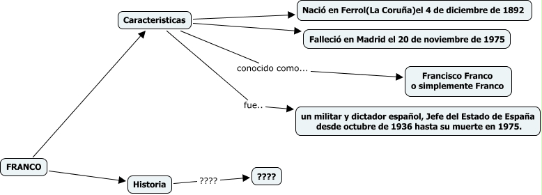 Este mapa conceptual tiene información relacionada a: 25.Alfonso diaz camacho.franco, FRANCO Caracteristicas, Caracteristicas Nació en Ferrol(La Coruña)el 4 de diciembre de 1892, Caracteristicas conocido como... Francisco Franco o simplemente Franco, Caracteristicas Falleció en Madrid el 20 de noviembre de 1975, Historia ???? ????, Caracteristicas fue.. un militar y dictador español, Jefe del Estado de España desde octubre de 1936 hasta su muerte en 1975., FRANCO Historia