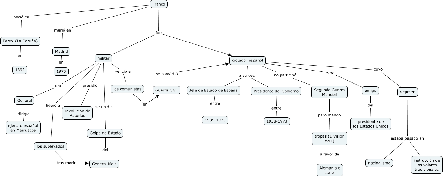Este Cmap, tiene información relacionada con: 17.Carlos Rodríguez Daza.Franco, régimen estaba basado en instrucción de los valores tradicionales, Franco fue militar, militar era General, Franco fue dictador español, régimen estaba basado en nacinalismo, Guerra Civil se convirtió dictador español, tropas (División Azul) a favor de Alemania e Italia, Presidente del Gobierno entre 1938-1973, Franco murió en Madrid, Franco nació en Ferrol (La Coruña), los sublevados tras morir General Mola, amigo del presidente de los Estados Unidos, militar presidió revolución de Asturias, los comunistas en Guerra Civil, dictador español era amigo, dictador español a su vez Jefe de Estado de España, Ferrol (La Coruña) en 1892, militar venció a los comunistas, dictador español a su vez Presidente del Gobierno, Segunda Guerra Mundial pero mandó tropas (División Azul)