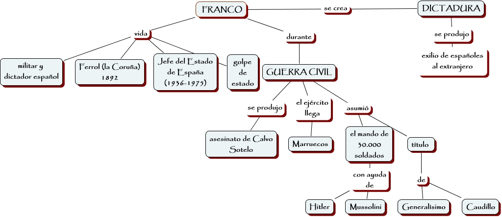 Este mapa conceptual tiene información relacionada a: 14.Marina Jiménez Pérez. Franco, GUERRA CIVIL el ejército llega Marruecos, FRANCO vida militar y dictador español, FRANCO se crea DICTADURA, FRANCO durante GUERRA CIVIL, el mando de 30.000 soldados con ayuda de Hitler, el mando de 30.000 soldados con ayuda de Mussolini, FRANCO vida golpe de estado, GUERRA CIVIL se produjo asesinato de Calvo Sotelo, título de Generalísimo, FRANCO vida Ferrol (la Coruña) 1892