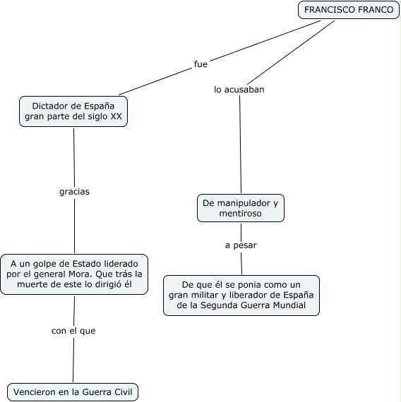 Este mapa conceptual tiene información relacionada a: 12.Rafael Fernández Aragón.Franco, De manipulador y mentiroso a pesar De que él se ponia como un gran militar y liberador de España de la Segunda Guerra Mundial, FRANCISCO FRANCO fue Dictador de España gran parte del siglo XX, Dictador de España gran parte del siglo XX gracias A un golpe de Estado liderado por el general Mora. Que trás la muerte de este lo dirigió él, FRANCISCO FRANCO lo acusaban De manipulador y mentiroso, A un golpe de Estado liderado por el general Mora. Que trás la muerte de este lo dirigió él con el que Vencieron en la Guerra Civil