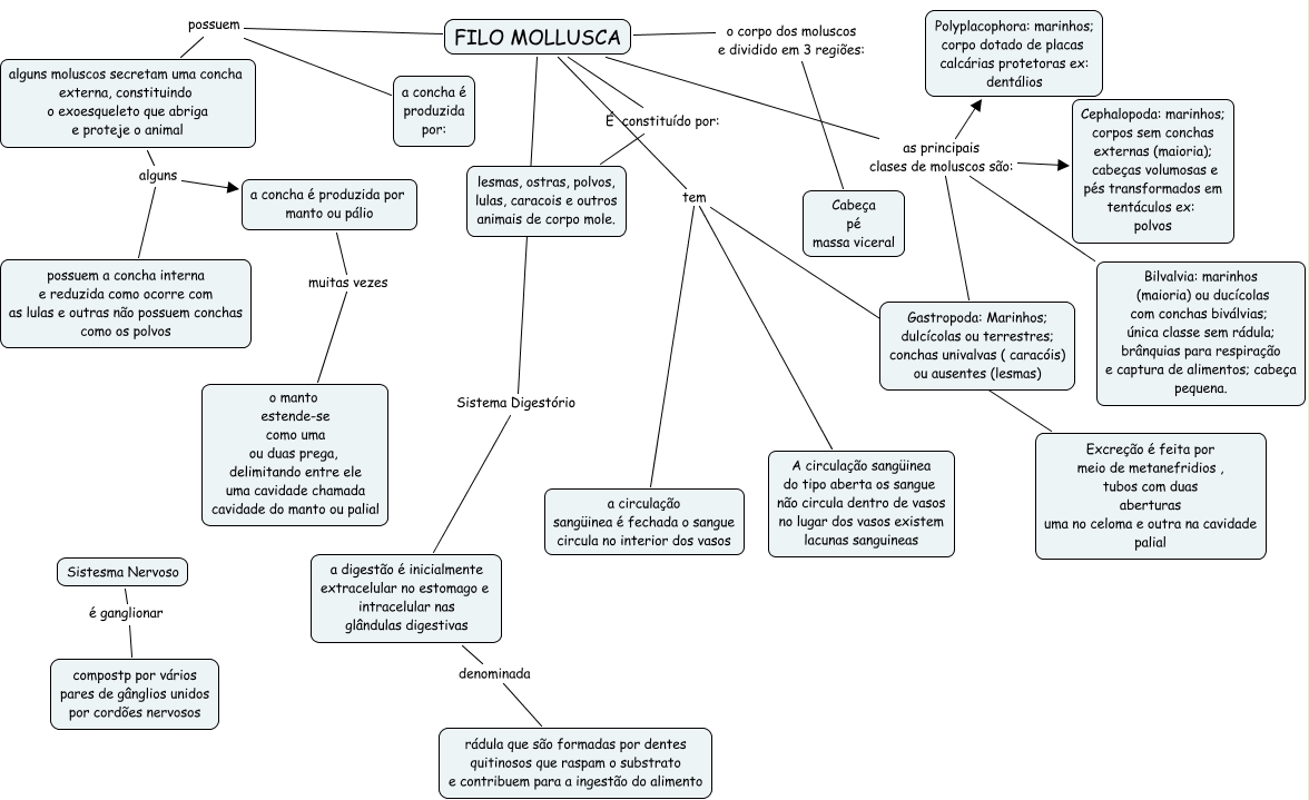 Esse mapa conceitual, produzido no IHMC CmapTools, tem a informação relacionada a: Filo mollusca, FILO MOLLUSCA as principais clases de moluscos são: Cephalopoda: marinhos; corpos sem conchas externas (maioria); cabeças volumosas e pés transformados em tentáculos ex: polvos, FILO MOLLUSCA possuem a concha é produzida por:, FILO MOLLUSCA Sistema Digestório a digestão é inicialmente extracelular no estomago e intracelular nas glândulas digestivas, FILO MOLLUSCA tem Excreção é feita por meio de metanefridios , tubos com duas aberturas uma no celoma e outra na cavidade palial, FILO MOLLUSCA tem A circulação sangüinea do tipo aberta os sangue não circula dentro de vasos no lugar dos vasos existem lacunas sanguineas, a concha é produzida por manto ou pálio muitas vezes o manto estende-se como uma ou duas prega, delimitando entre ele uma cavidade chamada cavidade do manto ou palial, FILO MOLLUSCA o corpo dos moluscos e dividido em 3 regiões: Cabeça pé massa viceral, FILO MOLLUSCA as principais clases de moluscos são: Polyplacophora: marinhos; corpo dotado de placas calcárias protetoras ex: dentálios, alguns moluscos secretam uma concha externa, constituindo o exoesqueleto que abriga e proteje o animal alguns a concha é produzida por manto ou pálio, FILO MOLLUSCA É constituído por: lesmas, ostras, polvos, lulas, caracois e outros animais de corpo mole., Sistesma Nervoso é ganglionar compostp por vários pares de gânglios unidos por cordões nervosos, FILO MOLLUSCA as principais clases de moluscos são: Bilvalvia: marinhos (maioria) ou ducícolas com conchas biválvias; única classe sem rádula; brânquias para respiração e captura de alimentos; cabeça pequena., FILO MOLLUSCA as principais clases de moluscos são: Gastropoda: Marinhos; dulcícolas ou terrestres; conchas univalvas ( caracóis) ou ausentes (lesmas), a digestão é inicialmente extracelular no estomago e intracelular nas glândulas digestivas denominada rádula que são formadas por dentes quitinosos que raspam o substrato e contribuem para a ingestão do alimento, FILO MOLLUSCA tem a circulação sangüinea é fechada o sangue circula no interior dos vasos, alguns moluscos secretam uma concha externa, constituindo o exoesqueleto que abriga e proteje o animal alguns possuem a concha interna e reduzida como ocorre com as lulas e outras não possuem conchas como os polvos, FILO MOLLUSCA possuem alguns moluscos secretam uma concha externa, constituindo o exoesqueleto que abriga e proteje o animal