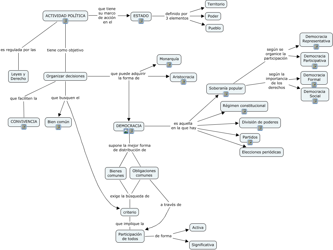 Este mapa conceptual tiene información relacionada a: UD7_PolíticaDemocráticaYParticipaciónCiudadana, ESTADO definido por 3 elementos Territorio, Bienes comunes exige la búsqueda de criterio, Obligaciones comunes a través de Participación de todos, DEMOCRACIA es aquella en la que hay Partidos, Organizar decisiones que puede adquirir la forma de Monarquía, ESTADO definido por 3 elementos Pueblo, DEMOCRACIA supone la mejor forma de distribución de Obligaciones comunes, Soberanía popular según la importancia de los derechos Democracia Social, Organizar decisiones que puede adquirir la forma de Aristocracia, ACTIVIDAD POLÍTICA tiene como objetivo Organizar decisiones, Soberanía popular según se organice la participación Democracia Participativa, DEMOCRACIA supone la mejor forma de distribución de Bienes comunes, Obligaciones comunes exige la búsqueda de criterio, ACTIVIDAD POLÍTICA que tiene su marco de acción en el ESTADO, DEMOCRACIA es aquella en la que hay División de poderes, Organizar decisiones que puede adquirir la forma de Aristocracia, DEMOCRACIA es aquella en la que hay Régimen constitucional, Participación de todos de forma Significativa, ACTIVIDAD POLÍTICA es regulada por las Leyes y Derecho, DEMOCRACIA es aquella en la que hay Elecciones periódicas