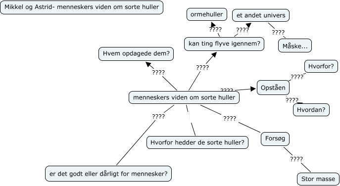This Concept Map, created with IHMC CmapTools, has information related to: Astrid & Mikkel, Opståen ???? Hvordan?, menneskers viden om sorte huller ???? Opståen, menneskers viden om sorte huller ???? Hvem opdagede dem?, et andet univers ???? Måske..., Forsøg ???? Stor masse, kan ting flyve igennem? ???? et andet univers, kan ting flyve igennem? ???? ormehuller, Opståen ???? Hvorfor?, menneskers viden om sorte huller ???? kan ting flyve igennem?, menneskers viden om sorte huller ???? er det godt eller dårligt for mennesker?, menneskers viden om sorte huller ???? Forsøg, menneskers viden om sorte huller Hvorfor hedder de sorte huller?
