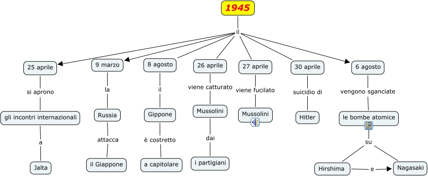 Questa Cmap, creata con IHMC CmapTools, contiene informazioni relative a: 1945, gli incontri internazionali a Jalta, le bombe atomice su Nagasaki, 26 aprile viene catturato Mussolini, 30 aprile suicidio di Hitler, 1945 il 6 agosto, 8 agosto il Gippone, 1945 il 30 aprile, 27 aprile viene fucilato Mussolini, 1945 il 25 aprile, 6 agosto vengono sganciate le bombe atomice, 9 marzo la Russia, le bombe atomice su Hirshima, Gippone è costretto a capitolare, Russia attacca il Giappone, 25 aprile si aprono gli incontri internazionali, 1945 il 27 aprile, 1945 il 8 agosto, 1945 il 9 marzo, 1945 il 26 aprile, Hirshima e Nagasaki