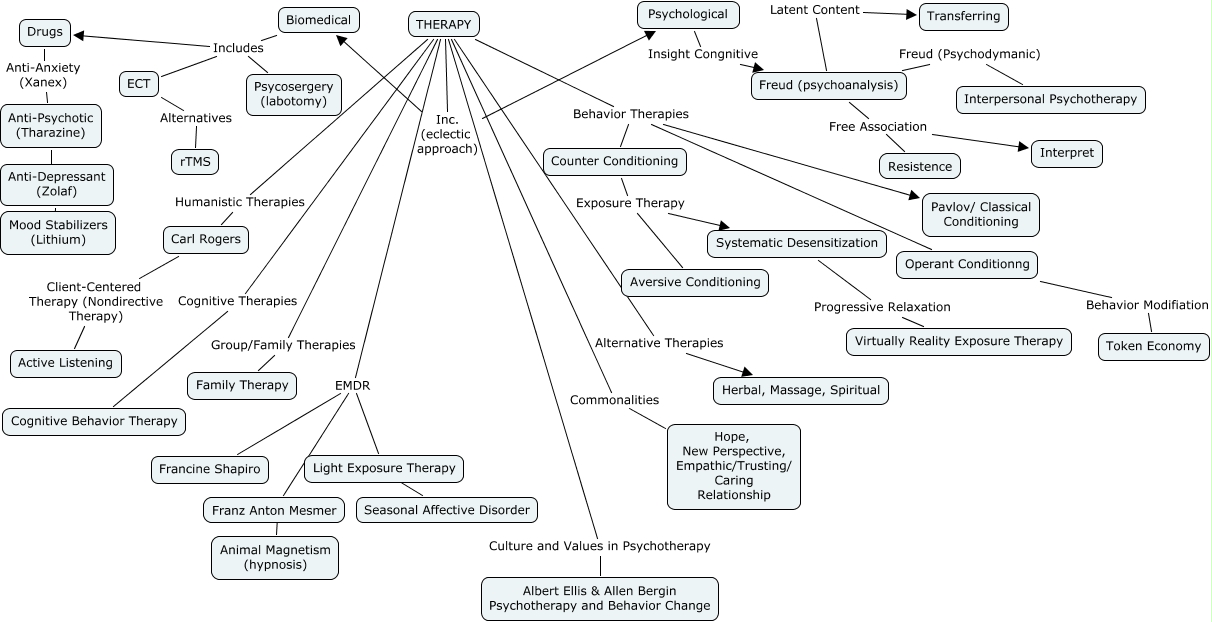 This Concept Map, created with IHMC CmapTools, has information related to: Ch.14 Ashley Urquhart, Psychological Insight Congnitive Freud (psychoanalysis), Systematic Desensitization Progressive Relaxation Virtually Reality Exposure Therapy, Anti-Depressant (Zolaf) ???? Mood Stabilizers (Lithium), THERAPY Behavior Therapies Operant Conditionng, Freud (psychoanalysis) Free Association Resistence, THERAPY Humanistic Therapies Carl Rogers, THERAPY Behavior Therapies Pavlov/ Classical Conditioning, Franz Anton Mesmer ???? Animal Magnetism (hypnosis), THERAPY Inc. (eclectic approach) Psychological, THERAPY EMDR Light Exposure Therapy, THERAPY Inc. (eclectic approach) Biomedical, THERAPY Commonalities Hope, New Perspective, Empathic/Trusting/ Caring Relationship, Operant Conditionng Behavior Modifiation Token Economy, Counter Conditioning Exposure Therapy Systematic Desensitization, THERAPY Behavior Therapies Counter Conditioning, Biomedical Includes Psycosergery (labotomy), Freud (psychoanalysis) Latent Content Transferring, Carl Rogers Client-Centered Therapy (Nondirective Therapy) Active Listening, Biomedical Includes ECT, Anti-Psychotic (Tharazine) ???? Anti-Depressant (Zolaf)