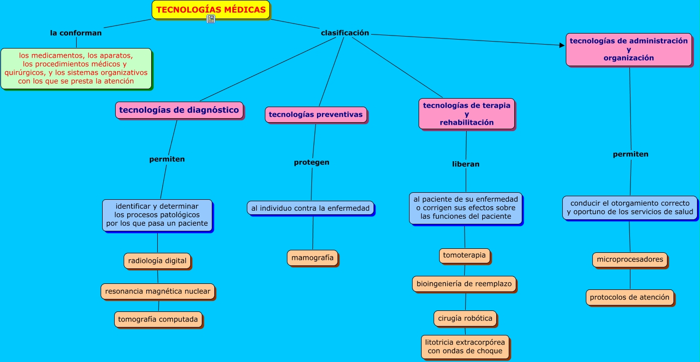 Este mapa conceptual tiene información relacionada a: TECNOLOG�?AS MÉDICAS, cirugía robótica ???? litotricia extracorpórea con ondas de choque, al paciente de su enfermedad o corrigen sus efectos sobre las funciones del paciente ???? tomoterapia, al individuo contra la enfermedad ???? mamografía, tomoterapia ???? bioingeniería de reemplazo, tecnologías de diagnóstico permiten identificar y determinar los procesos patológicos por los que pasa un paciente, identificar y determinar los procesos patológicos por los que pasa un paciente ???? radiología digital, bioingeniería de reemplazo ???? cirugía robótica, resonancia magnética nuclear ???? tomografía computada, tecnologías de administración y organización permiten conducir el otorgamiento correcto y oportuno de los servicios de salud, tecnologías de terapia y rehabilitación liberan al paciente de su enfermedad o corrigen sus efectos sobre las funciones del paciente, TECNOLOG�?AS MÉDICAS la conforman los medicamentos, los aparatos, los procedimientos médicos y quirúrgicos, y los sistemas organizativos con los que se presta la atención, TECNOLOG�?AS MÉDICAS clasificación tecnologías de diagnóstico, TECNOLOG�?AS MÉDICAS clasificación tecnologías de administración y organización, radiología digital ???? resonancia magnética nuclear, tecnologías preventivas protegen al individuo contra la enfermedad, TECNOLOG�?AS MÉDICAS clasificación tecnologías de terapia y rehabilitación, conducir el otorgamiento correcto y oportuno de los servicios de salud ???? microprocesadores, microprocesadores ???? protocolos de atención, TECNOLOG�?AS MÉDICAS clasificación tecnologías preventivas