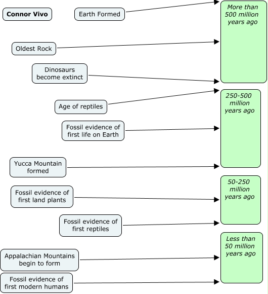This Concept Map, created with IHMC CmapTools, has information related to: Connor Vivo new, Yucca Mountain formed 250-500 million years ago, Appalachian Mountains begin to form Less than 50 million years ago, Oldest Rock More than 500 million years ago, Fossil evidence of first modern humans Less than 50 million years ago, Fossil evidence of first land plants 50-250 million years ago, Dinosaurs become extinct More than 500 million years ago, Earth Formed More than 500 million years ago, Fossil evidence of first reptiles 50-250 million years ago, Fossil evidence of first life on Earth 250-500 million years ago, Age of reptiles 250-500 million years ago