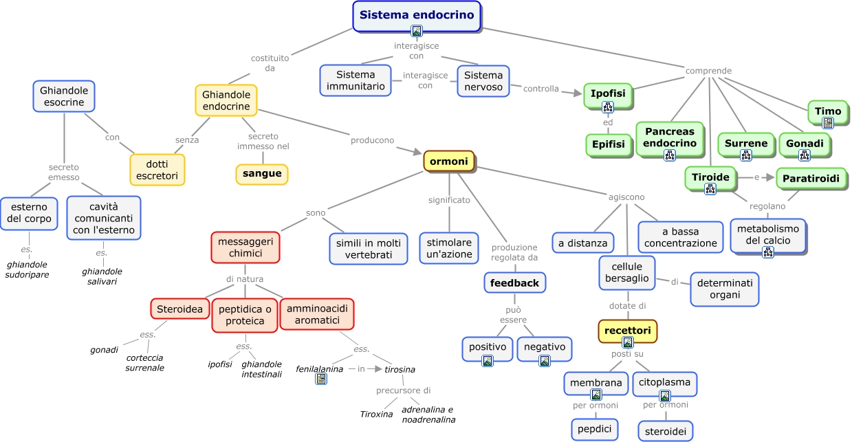 Questa Mappa Concettuale ha informazioni correlate a: Sistema_endocrino_introduzione, messaggeri chimici di natura Steroidea, Paratiroidi regolano metabolismo del calcio, Sistema endocrino comprende Tiroide, esterno del corpo es. ghiandole sudoripare, Ipofisi ed Epifisi, peptidica o proteica ess. ghiandole intestinali, amminoacidi aromatici ess. fenilalanina, tirosina precursore di Tiroxina, cavità comunicanti con l'esterno es. ghiandole salivari, Sistema endocrino comprende Ipofisi, recettori posti su citoplasma, tirosina precursore di adrenalina e noadrenalina, Sistema nervoso controlla Ipofisi, Sistema nervoso interagisce con Sistema immunitario, citoplasma per ormoni steroidei, ormoni agiscono cellule bersaglio, ormoni agiscono a bassa concentrazione, feedback può essere positivo, Tiroide regolano metabolismo del calcio, Sistema endocrino interagisce con Sistema immunitario