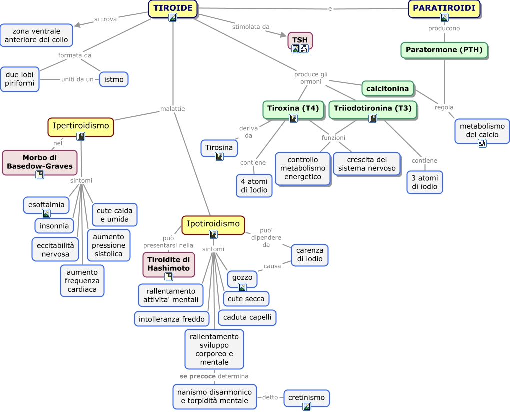 Questa Mappa Concettuale ha informazioni correlate a: Tiroide_paratiroidi, Tiroxina (T4) funzioni controllo metabolismo energetico, Ipotiroidismo puo' dipendere da carenza di iodio, calcitonina regola metabolismo del calcio, TIROIDE produce gli ormoni Tiroxina (T4), Morbo di Basedow-Graves nel Ipertiroidismo, Tiroxina (T4) deriva da Tirosina, Ipotiroidismo sintomi intolleranza freddo, TIROIDE formata da due lobi piriformi, Ipertiroidismo sintomi aumento pressione sistolica, rallentamento sviluppo corporeo e mentale se precoce determina nanismo disarmonico e torpidità mentale, due lobi piriformi uniti da un istmo, Triiodotironina (T3) funzioni controllo metabolismo energetico, Ipertiroidismo sintomi insonnia, TIROIDE e PARATIROIDI, nanismo disarmonico e torpidità mentale detto cretinismo, PARATIROIDI producono Paratormone (PTH), Ipotiroidismo sintomi cute secca, Ipotiroidismo sintomi rallentamento sviluppo corporeo e mentale, TIROIDE malattie Ipertiroidismo, Tiroidite di Hashimoto può presentarsi nella Ipotiroidismo