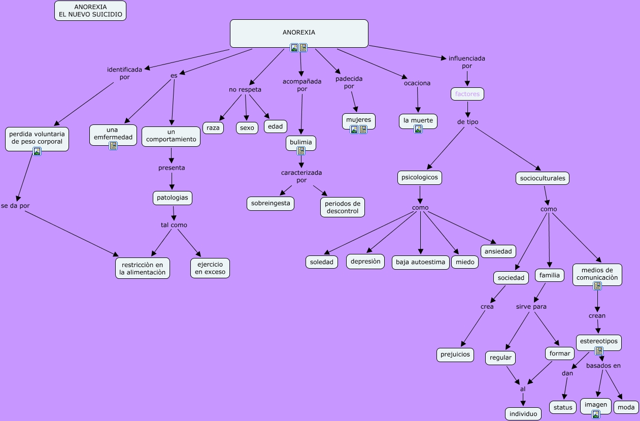 Este mapa conceptual tiene información relacionada a: LA ANOREXIA EL NUEVO SUICIDIO, ANOREXIA padecida por mujeres, sociedad crea prejuicios, ANOREXIA no respeta raza, socioculturales como medios de comunicaciòn, psicologicos como baja autoestima, psicologicos como miedo, ANOREXIA es una emfermedad, estereotipos dan status, perdida voluntaria de peso corporal se da por restricciòn en la alimentaciòn, regular al individuo