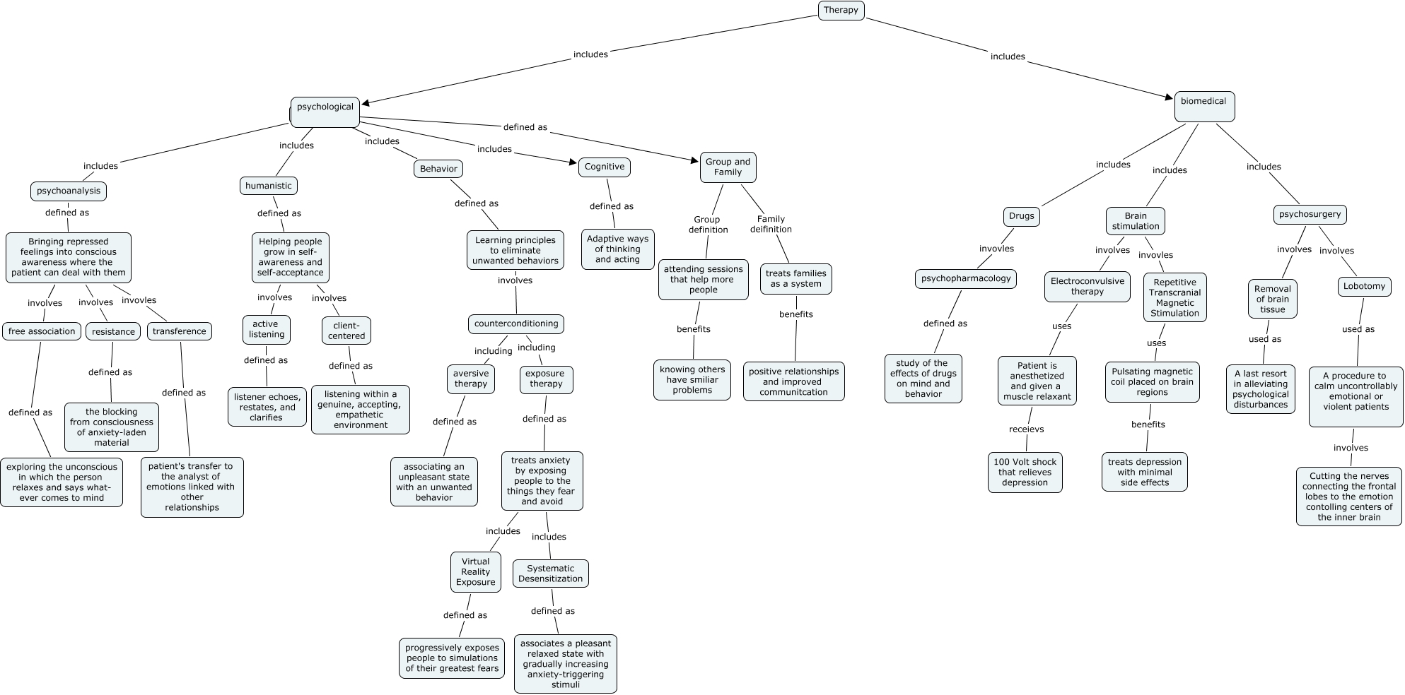 This Concept Map, created with IHMC CmapTools, has information related to: Ch. 14 Rachel Kradel, Brain stimulation involves Electroconvulsive therapy, active listening defined as listener echoes, restates, and clarifies, Biomedical includes Drugs, exposure therapy defined as treats anxiety by exposing people to the things they fear and avoid, Bringing repressed feelings into conscious awareness where the patient can deal with them invovles transference, Group and Family Family deifinition treats families as a system, free association defined as exploring the unconscious in which the person relaxes and says what- ever comes to mind, Systematic Desensitization defined as associates a pleasant relaxed state with gradually increasing anxiety-triggering stimuli, Behavior defined as Learning principles to eliminate unwanted behaviors, Cognitive defined as Adaptive ways of thinking and acting, psychological includes psychoanalysis, A procedure to calm uncontrollably emotional or violent patients involves Cutting the nerves connecting the frontal lobes to the emotion contolling centers of the inner brain, treats anxiety by exposing people to the things they fear and avoid includes Systematic Desensitization, transference defined as patient's transfer to the analyst of emotions linked with other relationships, psychological includes Behavior, psychological defined as Group and Family, humanistic defined as Helping people grow in self- awareness and self-acceptance, Therapy includes psychological, Drugs invovles psychopharmacology, counterconditioning including exposure therapy