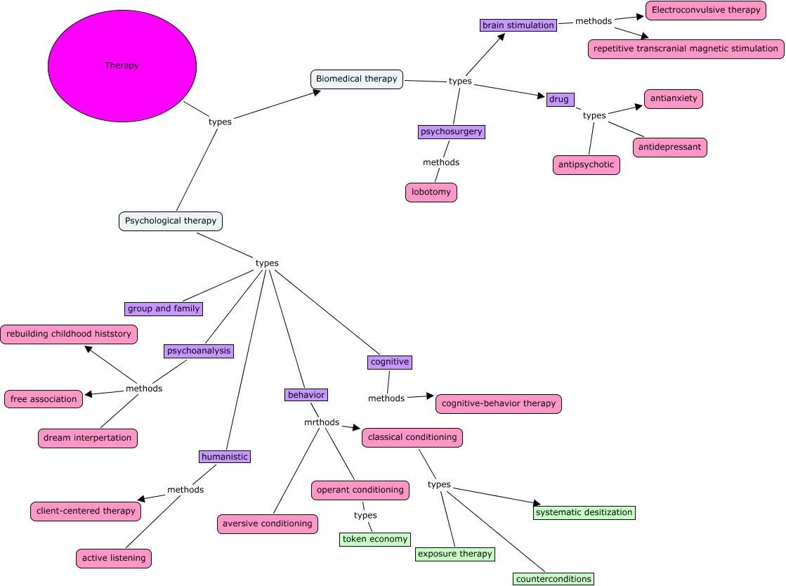 This Concept Map, created with IHMC CmapTools, has information related to: Ch14 amanda moretz, Therapy types Psychological therapy, brain stimulation methods repetitive transcranial magnetic stimulation, humanistic methods client-centered therapy, psychoanalysis methods free association, Psychological therapy types cognitive, humanistic methods active listening, classical conditioning types counterconditions, psychoanalysis methods dream interpertation, operant conditioning types token economy, Biomedical therapy types psychosurgery, drug types antidepressant, Psychological therapy types behavior, Biomedical therapy types drug, behavior mrthods aversive conditioning, behavior mrthods classical conditioning, drug types antipsychotic, classical conditioning types exposure therapy, Psychological therapy types group and family, Therapy types Biomedical therapy, Biomedical therapy types brain stimulation