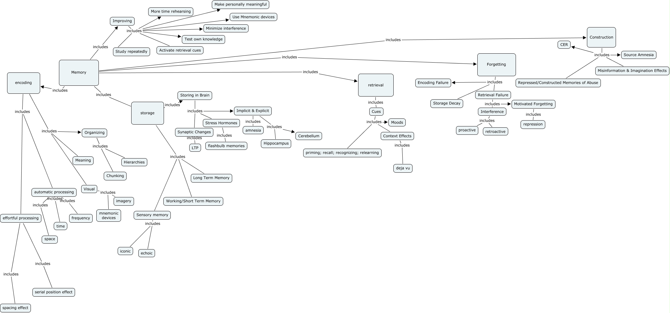 This Concept Map, created with IHMC CmapTools, has information related to: CH 8 Joseph Jones, retrieval includes Cues, Forgetting includes Retrieval Failure, Visual includes mnemonic devices, Improving includes More time rehearsing, Construction includes Misinformation & Imagination Effects, storage includes Working/Short Term Memory, Forgetting includes Encoding Failure, automatic processing includes frequency, Synaptic Changes includes LTP, encoding includes Visual, automatic processing includes space, Improving includes Test own knowledge, Improving includes Use Mnemonic devices, Stress Hormones includes flashbulb memories, Memory includes retrieval, Sensory memory includes echoic, Organizing includes Hierarchies, Improving includes Make personally meaningful, Improving includes Minimize interference, storage includes Long Term Memory