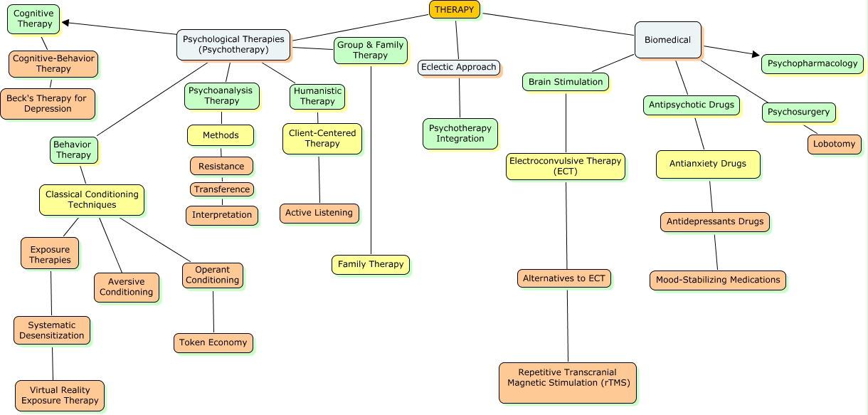 This Concept Map, created with IHMC CmapTools, has information related to: ch14 india hines, Classical Conditioning Techniques ???? Aversive Conditioning, THERAPY Biomedical Lobotomy, Psychological Therapies (Psychotherapy) Behavior Therapy Classical Conditioning Techniques, THERAPY Eclectic Approach Psychotherapy Integration, Brain Stimulation Electroconvulsive Therapy (ECT) Repetitive Transcranial Magnetic Stimulation (rTMS), Cognitive Therapy Cognitive-Behavior Therapy Beck's Therapy for Depression, THERAPY Biomedical Psychopharmacology, THERAPY Psychological Therapies (Psychotherapy), Psychological Therapies (Psychotherapy) Group & Family Therapy Family Therapy, Antipsychotic Drugs Antianxiety Drugs Mood-Stabilizing Medications, THERAPY Cognitive Therapy, Systematic Desensitization Virtual Reality Exposure Therapy, Psychological Therapies (Psychotherapy) Psychoanalysis Therapy Methods, THERAPY Biomedical Antipsychotic Drugs, Psychological Therapies (Psychotherapy) Humanistic Therapy Active Listening, Classical Conditioning Techniques Exposure Therapies Systematic Desensitization, THERAPY Biomedical Brain Stimulation, Systematic Desensitization Virtual Reality Exposure Therapy, Classical Conditioning Techniques Operant Conditioning Token Economy, Methods Transference Interpretation