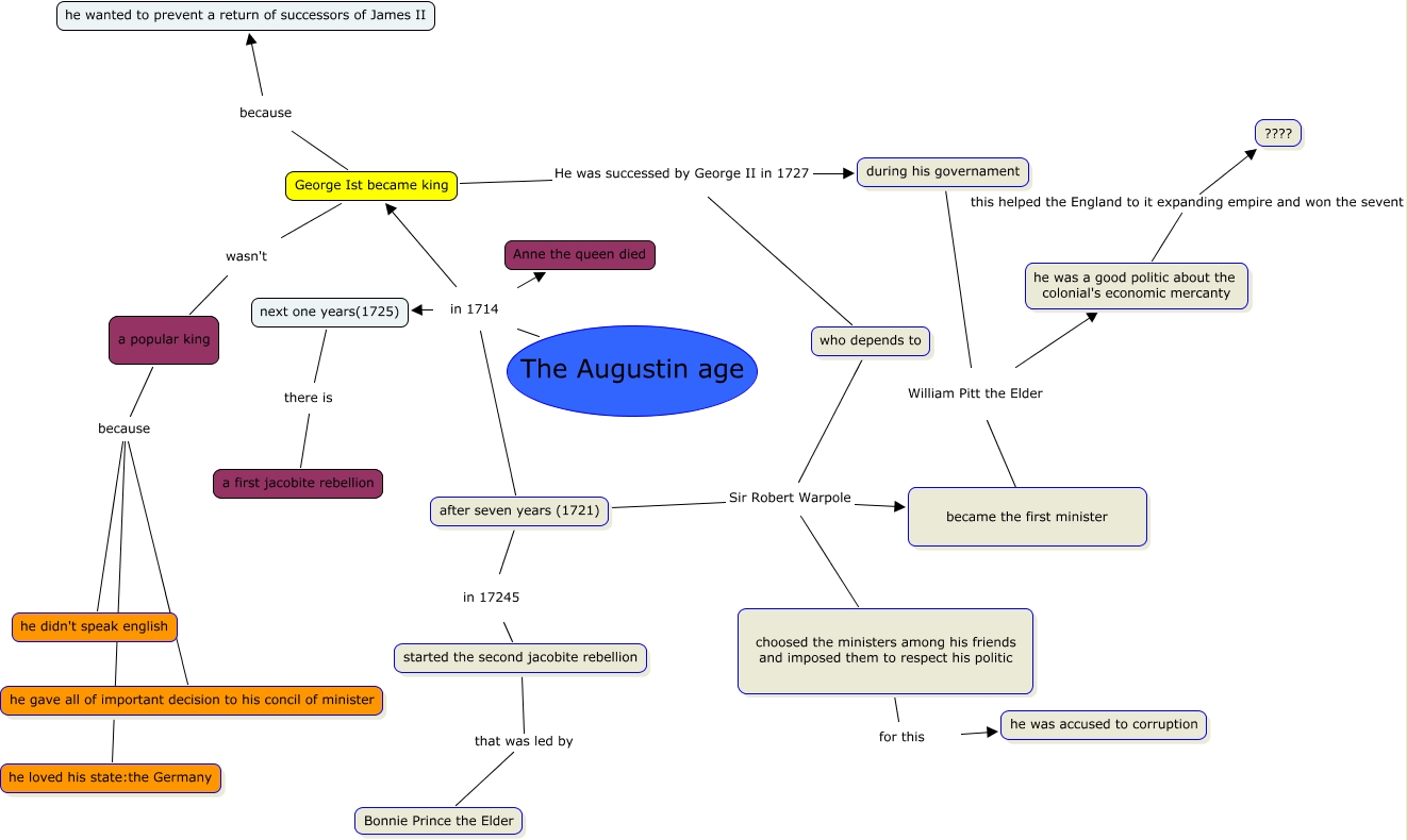 Questa Mappa Concettuale ha informazioni correlate a: Augustian age by Orciuolo, George Ist became king He was successed by George II in 1727 who depends to, who depends to Sir Robert Warpole became the first minister, he was a good politic about the colonial's economic mercanty this helped the England to it expanding empire and won the sevent ????, after seven years (1721) Sir Robert Warpole choosed the ministers among his friends and imposed them to respect his politic, The Augustin age in 1714 after seven years (1721), after seven years (1721) Sir Robert Warpole became the first minister, a popular king because he didn't speak english, George Ist became king because he wanted to prevent a return of successors of James II, The Augustin age in 1714 George Ist became king, The Augustin age in 1714 next one years(1725), who depends to Sir Robert Warpole choosed the ministers among his friends and imposed them to respect his politic, George Ist became king wasn't a popular king, after seven years (1721) in 17245 started the second jacobite rebellion, choosed the ministers among his friends and imposed them to respect his politic for this he was accused to corruption, a popular king because he loved his state:the Germany, during his governament William Pitt the Elder he was a good politic about the colonial's economic mercanty, George Ist became king He was successed by George II in 1727 during his governament, The Augustin age in 1714 Anne the queen died, started the second jacobite rebellion that was led by Bonnie Prince the Elder, next one years(1725) there is a first jacobite rebellion