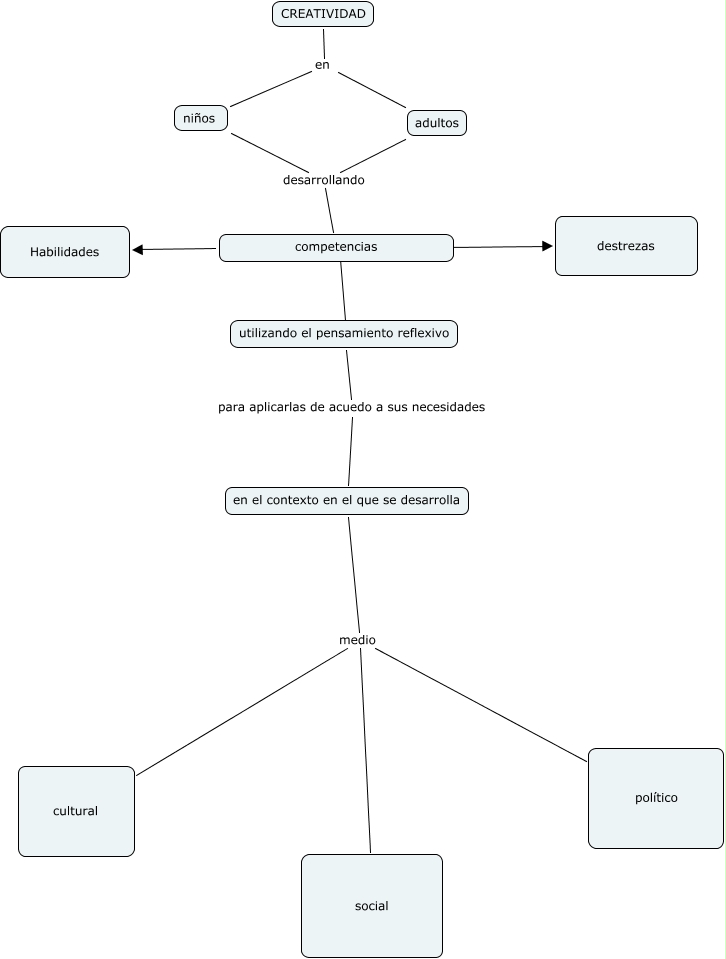 Este Cmap, tiene información relacionada con: creatividad, CREATIVIDAD en adultos, en el contexto en el que se desarrolla medio cultural, utilizando el pensamiento reflexivo para aplicarlas de acuedo a sus necesidades en el contexto en el que se desarrolla, competencias destrezas, en el contexto en el que se desarrolla medio social, adultos desarrollando competencias, niños desarrollando competencias, CREATIVIDAD en niños, competencias ???? ????, competencias ???? Habilidades, en el contexto en el que se desarrolla medio político
