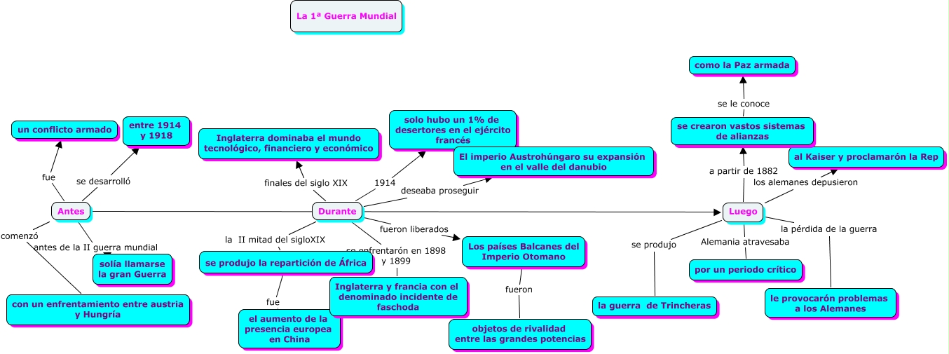 Este mapa conceptual tiene información relacionada a: 18.Milagros Moreno García-I Guerra mundial, Luego la pérdida de la guerra le provocarón problemas a los Alemanes, Durante deseaba proseguir El imperio Austrohúngaro su expansión en el valle del danubio, Durante fueron liberados Los países Balcanes del Imperio Otomano, Los países Balcanes del Imperio Otomano fueron objetos de rivalidad entre las grandes potencias, Antes fue un conflicto armado, Durante se enfrentarón en 1898 y 1899 Inglaterra y francia con el denominado incidente de faschoda, Durante finales del siglo XIX Inglaterra dominaba el mundo tecnológico, financiero y económico, Luego Alemania atravesaba por un periodo crítico, Durante 1914 solo hubo un 1% de desertores en el ejército francés, Antes se desarrolló entre 1914 y 1918