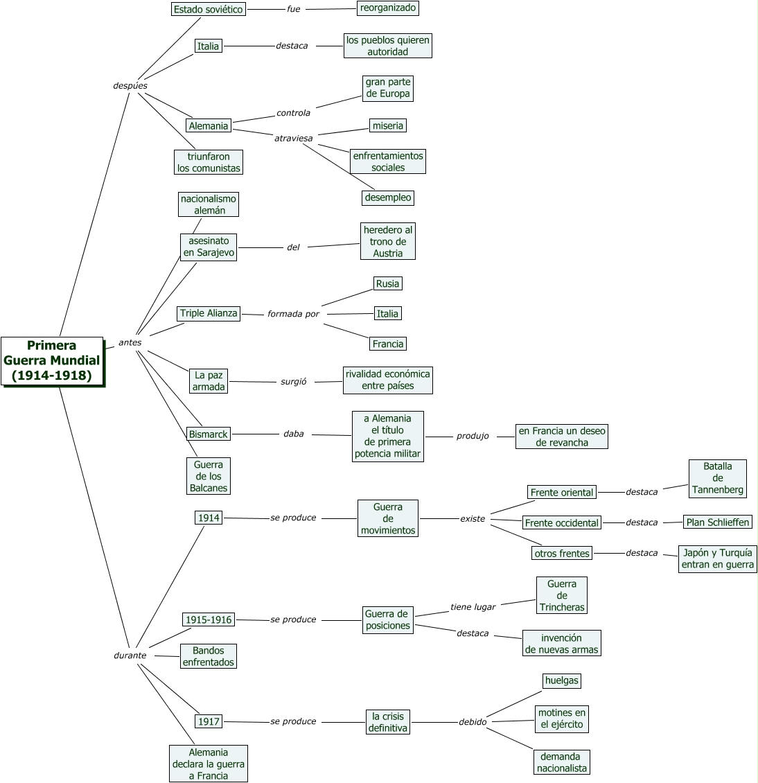 Este mapa conceptual tiene información relacionada a: 14.Marina Jiménez Pérez. Primera Guerra Mundial, Primera Guerra Mundial (1914-1918) antes asesinato en Sarajevo, Primera Guerra Mundial (1914-1918) durante 1914, asesinato en Sarajevo del heredero al trono de Austria, Bismarck daba a Alemania el título de primera potencia militar, Primera Guerra Mundial (1914-1918) durante Bandos enfrentados, Alemania atraviesa desempleo, 1914 se produce Guerra de movimientos, Estado soviético fue reorganizado, 1915-1916 se produce Guerra de posiciones, Primera Guerra Mundial (1914-1918) antes Bismarck, la crisis definitiva debido huelgas, Primera Guerra Mundial (1914-1918) antes La paz armada, Guerra de movimientos existe otros frentes, Primera Guerra Mundial (1914-1918) despúes Alemania, Primera Guerra Mundial (1914-1918) durante Alemania declara la guerra a Francia, Primera Guerra Mundial (1914-1918) despúes Estado soviético, Primera Guerra Mundial (1914-1918) despúes triunfaron los comunistas, Guerra de movimientos existe Frente occidental, 1917 se produce la crisis definitiva, Triple Alianza formada por Francia