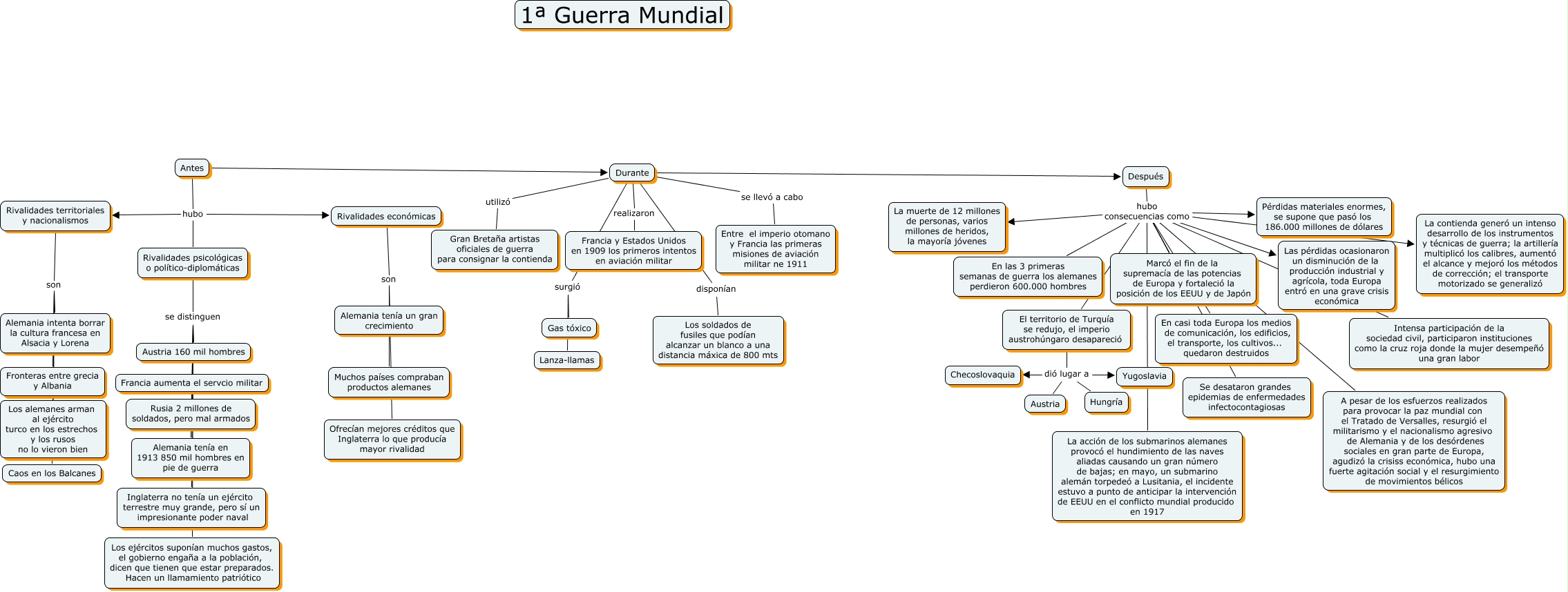 Este Cmap, tiene información relacionada con: 04.Macarena Astorga Arboleda.1ª Guerra Mundial, El territorio de Turquía se redujo, el imperio austrohúngaro desapareció dió lugar a Austria, Después hubo consecuencias como Se desataron grandes epidemias de enfermedades infectocontagiosas, Durante surgió Lanza-llamas, Durante disponían Los soldados de fusiles que podían alcanzar un blanco a una distancia máxica de 800 mts, Rivalidades territoriales y nacionalismos son Los alemanes arman al ejército turco en los estrechos y los rusos no lo vieron bien, Durante utilizó Gran Bretaña artistas oficiales de guerra para consignar la contienda, Durante se llevó a cabo Entre el imperio otomano y Francia las primeras misiones de aviación militar ne 1911, Rivalidades territoriales y nacionalismos son Fronteras entre grecia y Albania, El territorio de Turquía se redujo, el imperio austrohúngaro desapareció dió lugar a Yugoslavia, Después hubo consecuencias como La muerte de 12 millones de personas, varios millones de heridos, la mayoría jóvenes, Después hubo consecuencias como La contienda generó un intenso desarrollo de los instrumentos y técnicas de guerra; la artillería multiplicó los calibres, aumentó el alcance y mejoró los métodos de corrección; el transporte motorizado se generalizó, Rivalidades psicológicas o político-diplomáticas se distinguen Austria 160 mil hombres, Después hubo consecuencias como Intensa participación de la sociedad civil, participaron instituciones como la cruz roja donde la mujer desempeñó una gran labor, Rivalidades psicológicas o político-diplomáticas se distinguen Rusia 2 millones de soldados, pero mal armados, Rivalidades psicológicas o político-diplomáticas se distinguen Inglaterra no tenía un ejército terrestre muy grande, pero sí un impresionante poder naval, Después hubo consecuencias como El territorio de Turquía se redujo, el imperio austrohúngaro desapareció, Antes hubo Rivalidades psicológicas o político-diplomáticas, Después hubo consecuencias como En las 3 primeras semanas de guerra los alemanes perdieron 600.000 hombres, Rivalidades psicológicas o político-diplomáticas se distinguen Alemania tenía en 1913 850 mil hombres en pie de guerra, Después hubo consecuencias como La acción de los submarinos alemanes provocó el hundimiento de las naves aliadas causando un gran número de bajas; en mayo, un submarino alemán torpedeó a Lusitania, el incidente estuvo a punto de anticipar la intervención de EEUU en el conflicto mundial producido en 1917