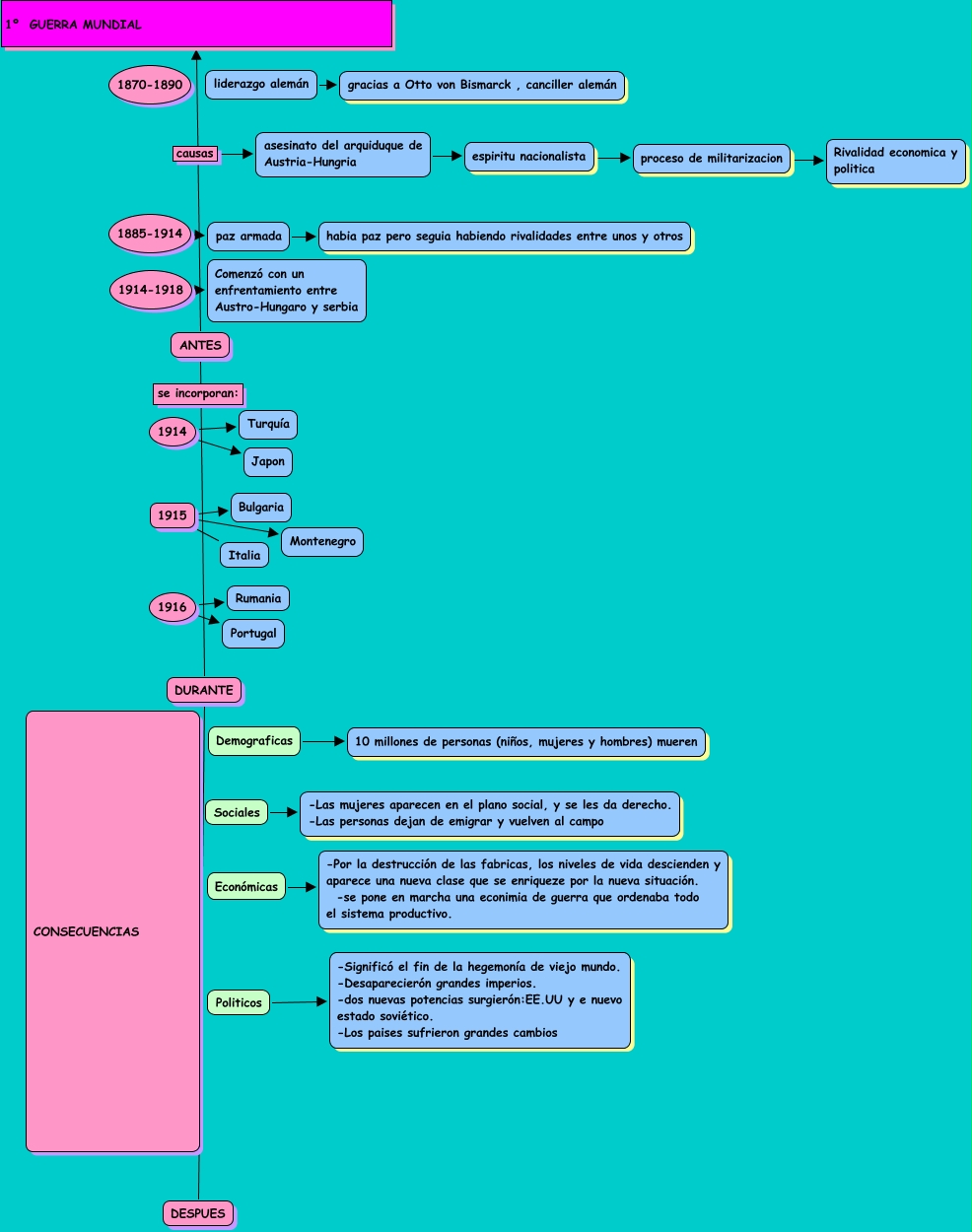 Este mapa conceptual tiene información relacionada a: 02.Marina Aragon de Lema. 1º guerra mundial, DURANTE DESPUES, 1915 Bulgaria, 1916 Portugal, 1915 Montenegro, ANTES 1º GUERRA MUNDIAL, Sociales -Las mujeres aparecen en el plano social, y se les da derecho. -Las personas dejan de emigrar y vuelven al campo, Demograficas 10 millones de personas (niños, mujeres y hombres) mueren, 1914-1918 Comenzó con un enfrentamiento entre Austro-Hungaro y serbia, 1916 Rumania, 1914 Japon
