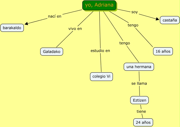 adriana, yo, Adriana vivo en Galadako, yo, Adriana nací en barakaldo, yo, Adriana tengo una hermana, yo, Adriana tengo 16 años, yo, Adriana estudio en colegio Vi, Eztizen tiene 24 años, una hermana se llama Eztizen, yo, Adriana soy castaña