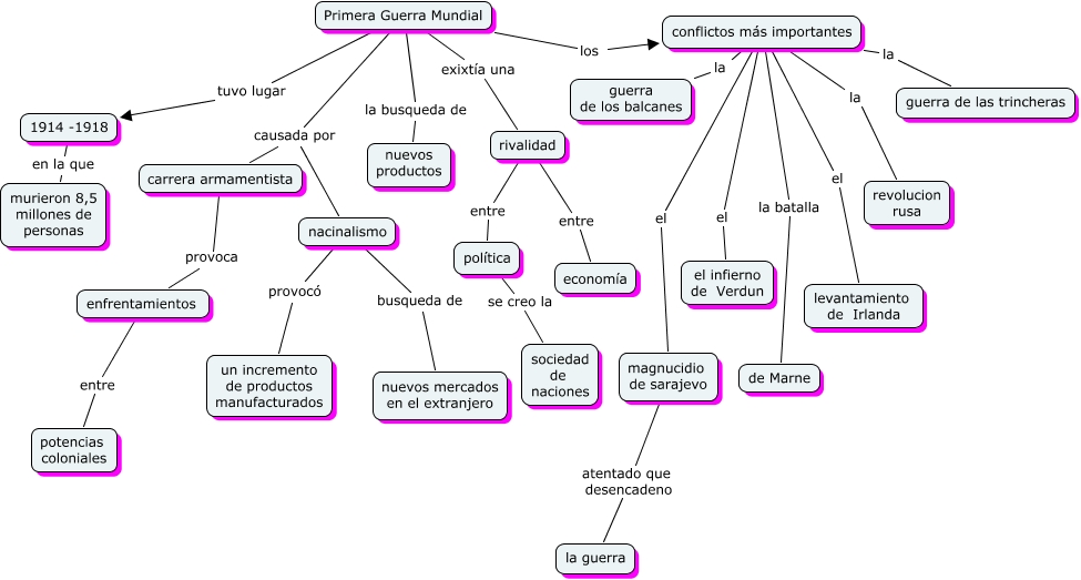 Este Cmap, tiene información relacionada con: primera guerra mundial, carrera armamentista provoca enfrentamientos, rivalidad entre política, Primera Guerra Mundial exixtía una rivalidad, política se creo la sociedad de naciones, rivalidad entre economía, conflictos más importantes el levantamiento de Irlanda, magnucidio de sarajevo atentado que desencadeno la guerra, conflictos más importantes la guerra de las trincheras, Primera Guerra Mundial la busqueda de nuevos productos, conflictos más importantes el el infierno de Verdun, conflictos más importantes la revolucion rusa, enfrentamientos entre potencias coloniales, Primera Guerra Mundial tuvo lugar 1914 -1918, conflictos más importantes el magnucidio de sarajevo, Primera Guerra Mundial causada por carrera armamentista, 1914 -1918 en la que murieron 8,5 millones de personas, nacinalismo busqueda de nuevos mercados en el extranjero, nacinalismo provocó un incremento de productos manufacturados, Primera Guerra Mundial causada por nacinalismo, conflictos más importantes la batalla de Marne