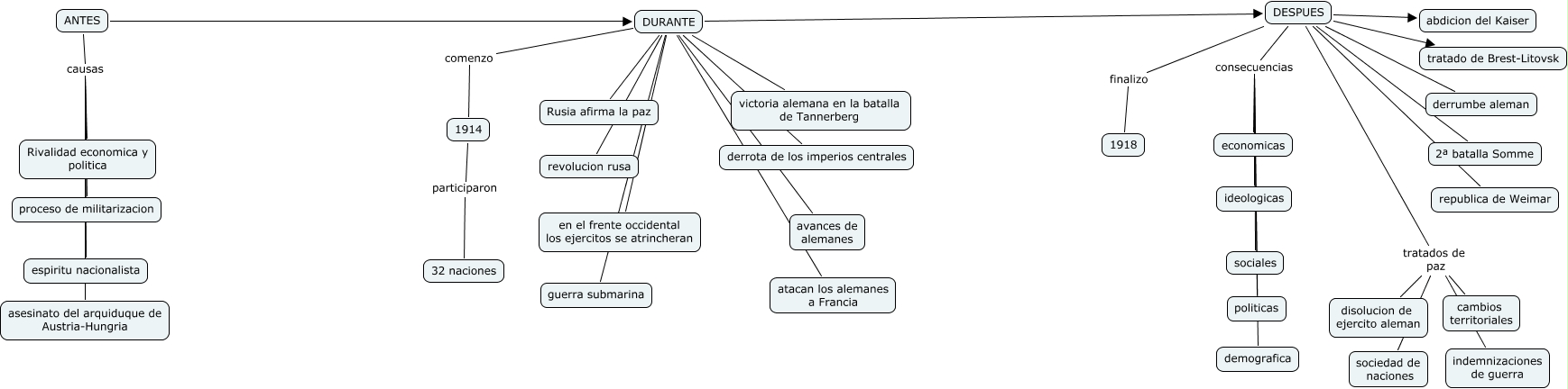 Este mapa conceptual tiene información relacionada a: 04.javier chaves suazo.1ª guerra mundial, DESPUES 2ª batalla Somme, DURANTE Rusia afirma la paz, DURANTE DESPUES, DESPUES finalizo 1918, ANTES DURANTE, 1914 participaron 32 naciones, DURANTE en el frente occidental los ejercitos se atrincheran, DESPUES tratado de Brest-Litovsk, DURANTE derrota de los imperios centrales, DESPUES consecuencias politicas