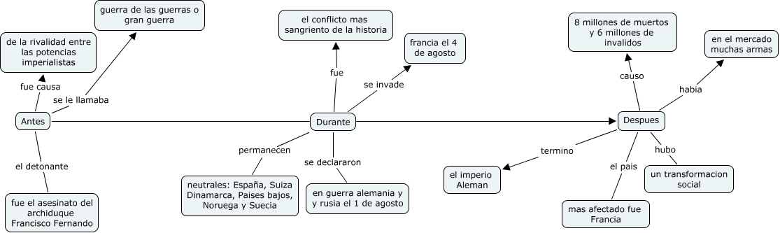 Este mapa conceptual tiene información relacionada a: 20.Pepe Romero Morales.I Guerra Mundial, Durante se declararon en guerra alemania y y rusia el 1 de agosto, Despues el pais mas afectado fue Francia, Durante fue el conflicto mas sangriento de la historia, Antes fue causa de la rivalidad entre las potencias imperialistas, Antes Despues, Durante se invade francia el 4 de agosto, Despues causo 8 millones de muertos y 6 millones de invalidos, Antes el detonante fue el asesinato del archiduque Francisco Fernando, Antes se le llamaba guerra de las guerras o gran guerra, Durante permanecen neutrales: España, Suiza Dinamarca, Paises bajos, Noruega y Suecia