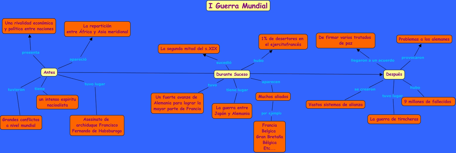 Este mapa conceptual tiene información relacionada a: 01.Paloma Acosta Aguilar.I Guerra Mundial, Antes tuvo lugar Asesinato de archiduque Francisco Fernando de Habsburogo, Antes tuvieron Grandes conflictos a nivel mundial, Después se crearon Vastos sistemas de alianza, Muchos aliados por ejemplo Francia Belgica Gran Bretaña Bélgica Etc..., Después hubo 9 millones de fallecidos, Después llegaron a un acuerdo De firmar varios tratados de paz, Después provocaron Problemas a los alemanes, Antes apareció La repartición entre África y Asia meridional, Antes tiene un intenso espiritu nacioalista, Durante Suceso tiene lugar La guerra entre Japón y Alemania