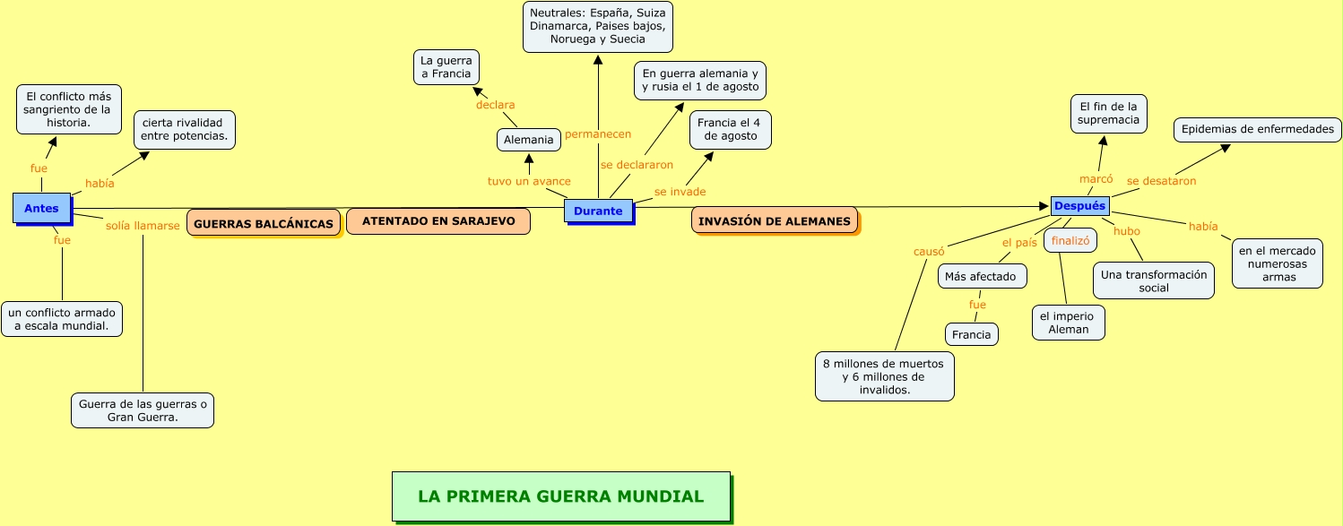 Este mapa conceptual tiene información relacionada a: 09.Sonia de Prado Baños.La Primera Guerra Mundial, Después marcó El fin de la supremacia, Después el país Más afectado, Después causó 8 millones de muertos y 6 millones de invalidos., Durante se declararon En guerra alemania y y rusia el 1 de agosto, Más afectado fue Francia, Después había en el mercado numerosas armas, Alemania declara La guerra a Francia, Durante se invade Francia el 4 de agosto, Antes fue El conflicto más sangriento de la historia., Durante tuvo un avance Alemania