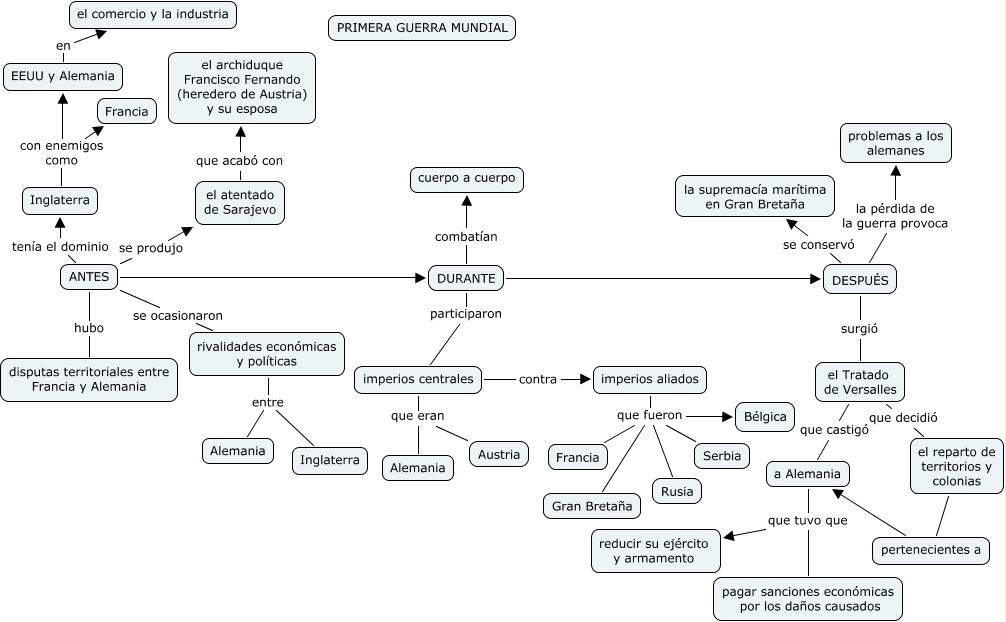Este mapa conceptual tiene información relacionada a: 24.Gema Vela González.I guerra mundial, imperios aliados que fueron Bélgica, ANTES se produjo el atentado de Sarajevo, DESPUÉS se conservó la supremacía marítima en Gran Bretaña, el atentado de Sarajevo que acabó con el archiduque Francisco Fernando (heredero de Austria) y su esposa, ANTES tenía el dominio Inglaterra, el Tratado de Versalles que decidió el reparto de territorios y colonias, imperios aliados que fueron Gran Bretaña, DURANTE combatían cuerpo a cuerpo, DESPUÉS la pérdida de la guerra provoca problemas a los alemanes, ANTES DURANTE